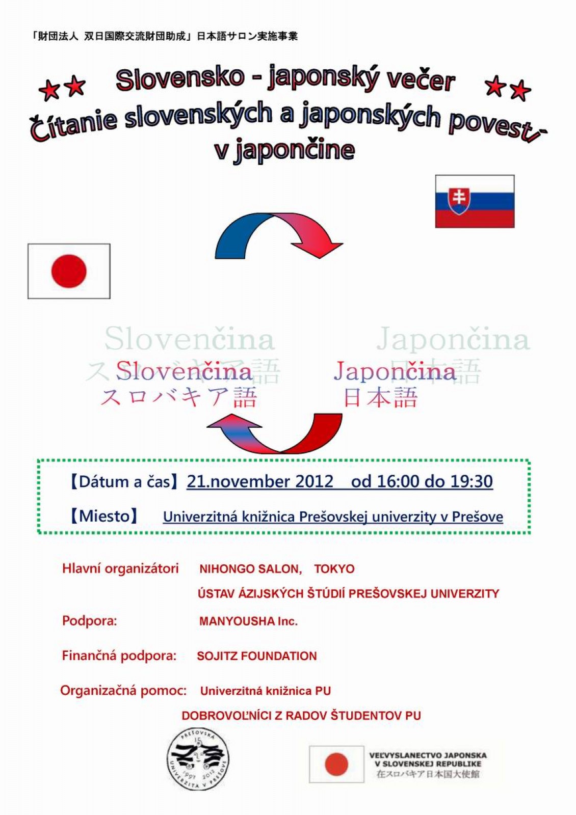 Čítanie slovenských a japonských povestí v japončine pod záštitou ÚÁŠ PU: SLOVENSKO - JAPONSKÝ VEČER