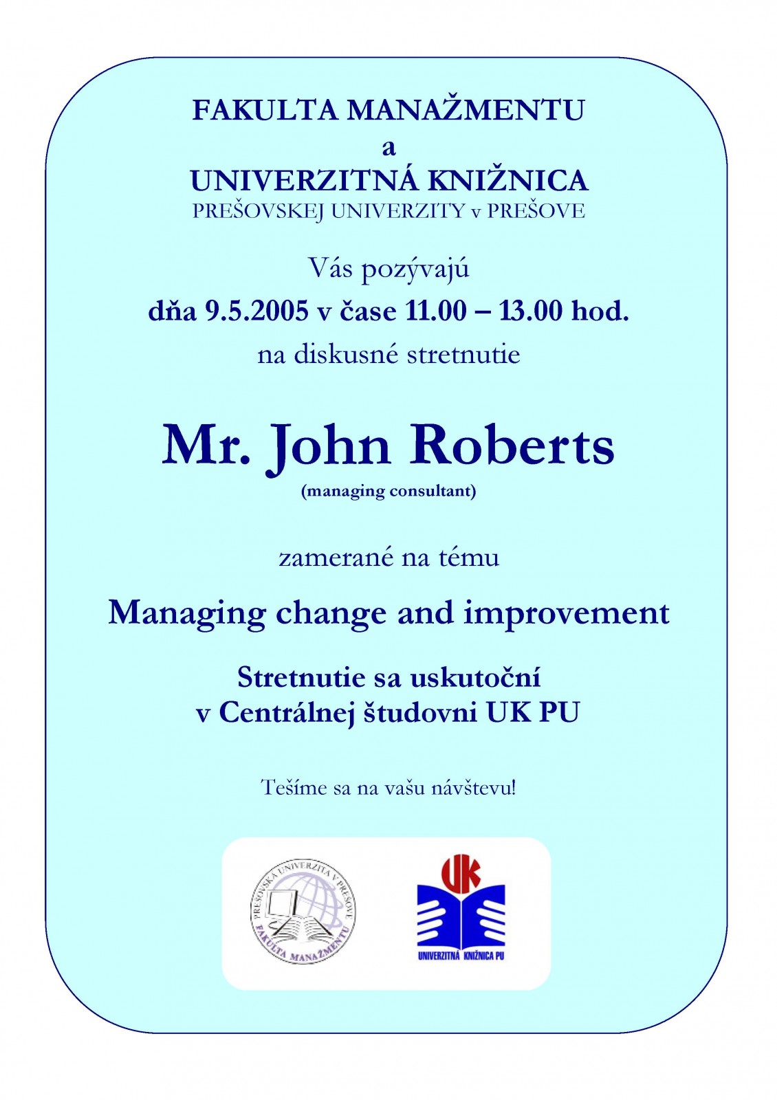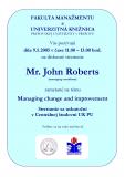 Diskusné stretnutie zamerané na tému Managing change and improvement. Prednášajúci: Mr. John Roberts