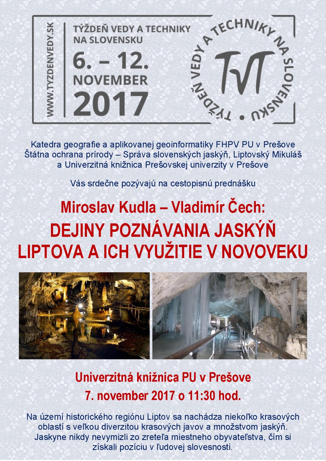 Cestopisná prednáška - Miroslav Kudla,Vladimír Čech: DEJINY POZNÁVANIA JASKÝŇ LIPTOVA A ICH VYUŽITIE V NOVOVEKU